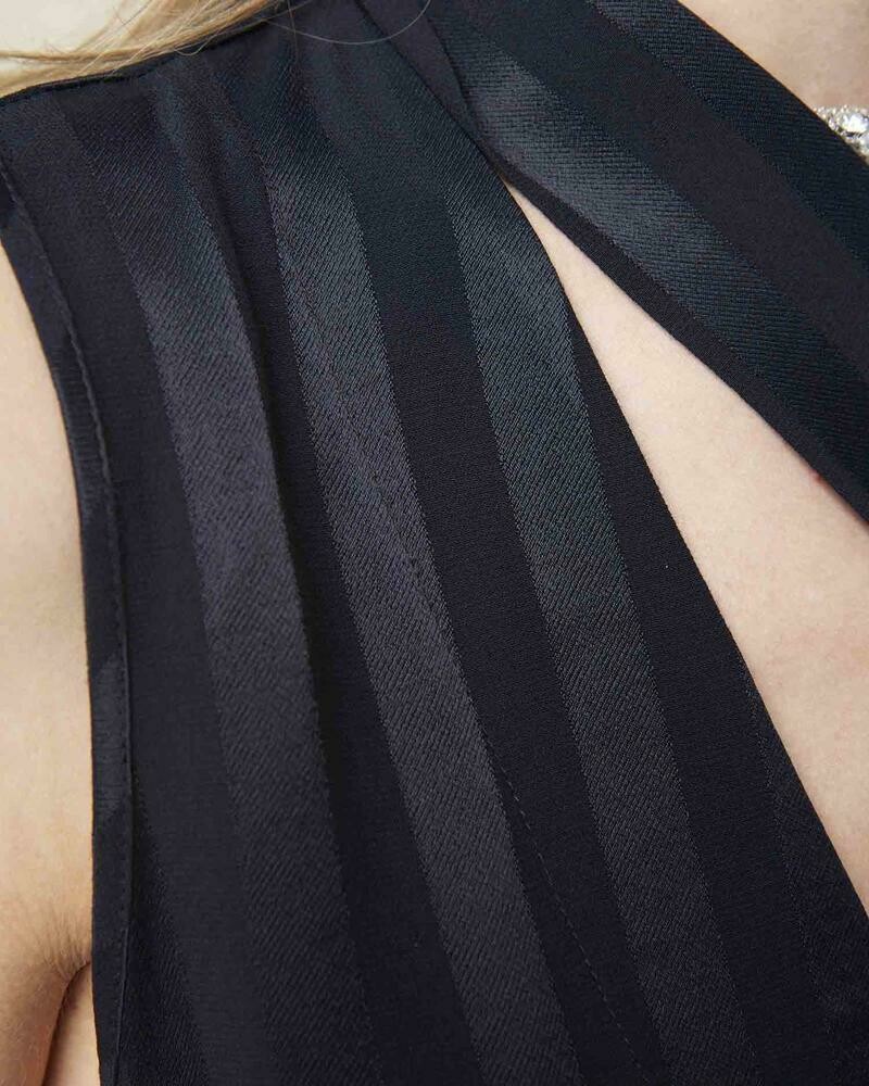 Blusa morbida senza maniche con nastro al collo da portare sciolto sul davanti o annodato a fiocco. Trama a righe. Sobria ed elegante.